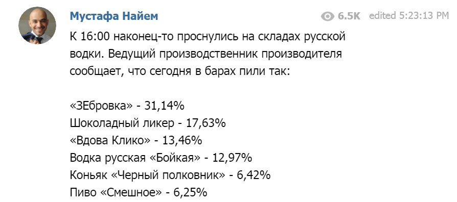 Народный депутат Мустафа Найем на своем канале в Telegram разместил своеобразный экзит-полл выборов президента, скрыв фамилии ведущих кандидатов вымышленными названиями спиртных напитков.