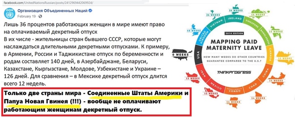 Официальный сайт ООН: "Только две страны мира - Соединённые Штаты Америки и Папуа Новая Гвинея(!!!) - вообще не оплачивают работающим женщинам декретный отпуск."