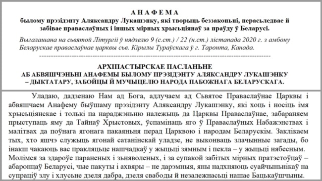 Глава Белорусской автокефальной православной церкви архиепископ Святослав Логин 22 ноября во время службы в соборе Святого Кирилла Туровского в Торонто (Канада) зачитал послание, в котором говорится, что Александр Лукашенко предан анафеме, пишет белорусская служба Радио Свобода.